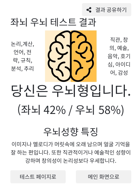 우리 두뇌가 좌뇌 우뇌로 나눠져 있는 거 다들 아시죠? 보통 좌뇌형이 이과, 우뇌형이 문과라고들 하는데 이 테스트 결과를 과 선택할 때 참고할 수 있을 거 같습니다.